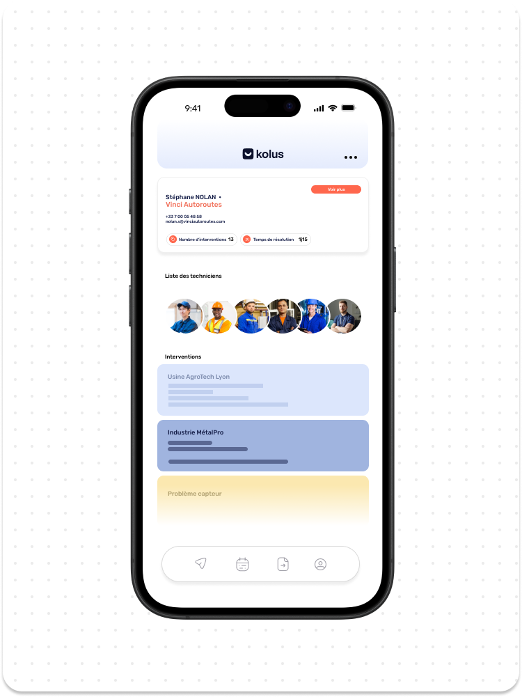 L’application Kolus a été conçue pour eux. Des écrans clairs, des actions simples, une interface qui fonctionne avec des doigts gantés. Chaque fonctionnalité a été pensée pour le contexte réel d’un technicien en intervention : peu de temps, parfois pas de réseau, et un besoin d’efficacité immédiate.