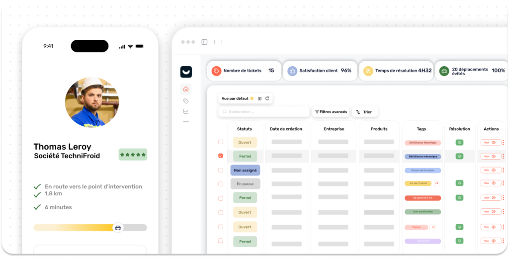 Continuité support → terrain : le ticket suit la demande de la qualification à l’intervention terrain.