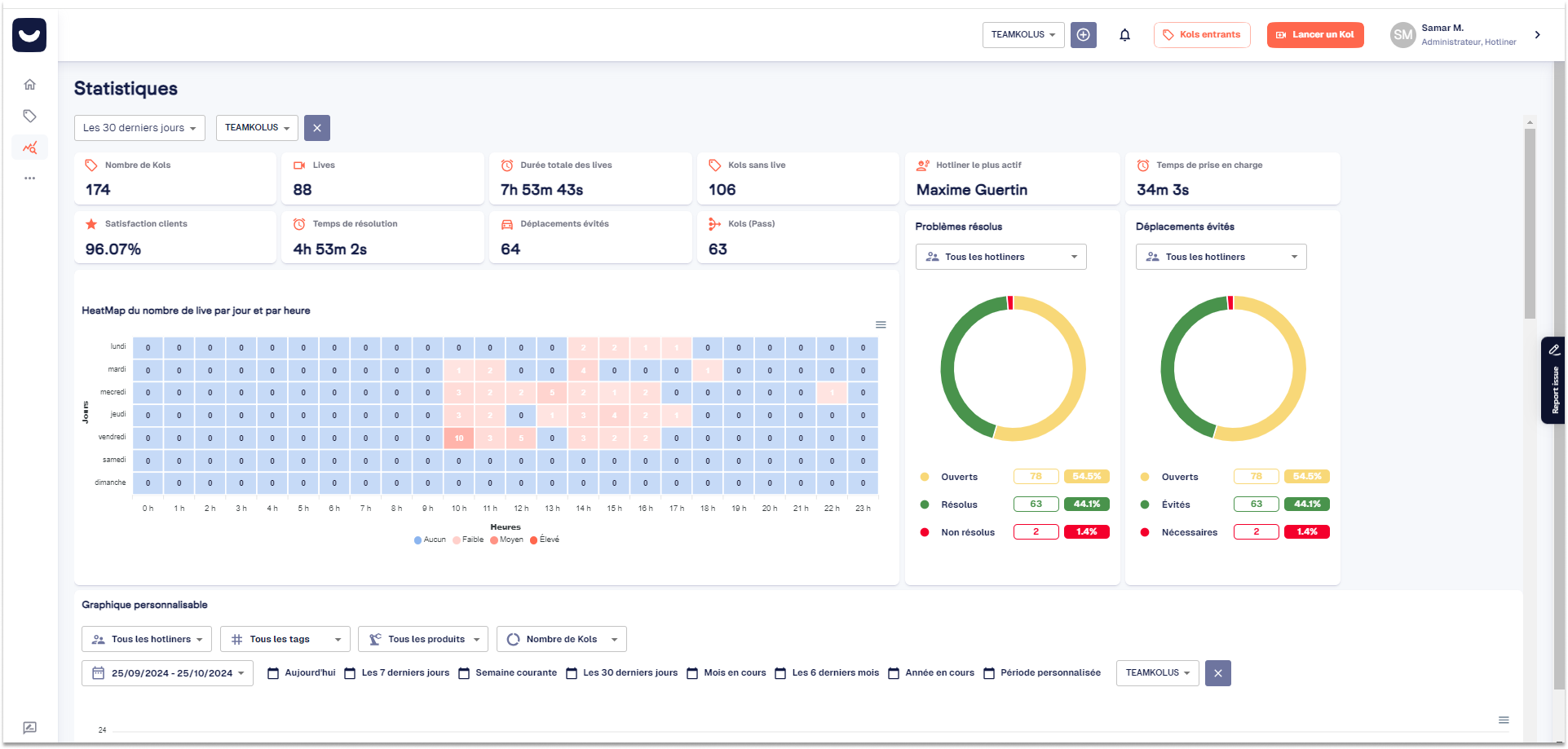 Parce que chaque entreprise est unique, notre Dashboard permet de sélectionner des données spécifiques. Par exemple, avec notre HeatMap des lives par jour et par heure, vous avez une vue sur les pics d’activité. Vous pouvez aussi savoir quel hotliner est le plus actif, suivre le nombre de problèmes résolus pour chaque entreprise, et même identifier les moments où la charge de travail est la plus élevée.
