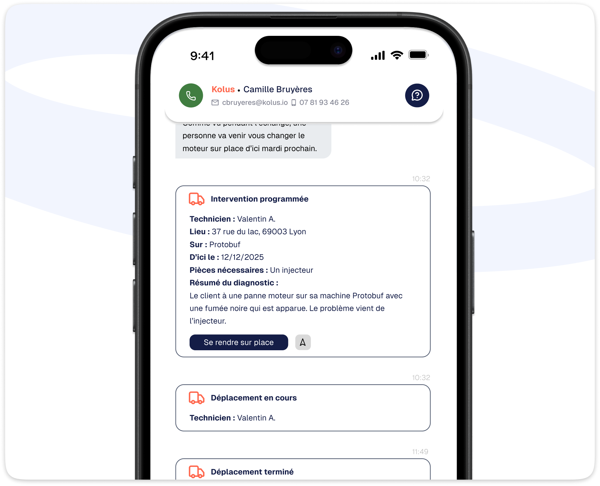 - L’IA Kolus transforme cette simple note vocale en rapport structuré, clair, conforme et prêt pour le SAV.