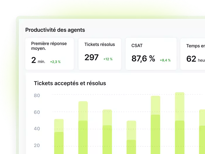 - Automatisation intelligente : les règles avancées et l’IA priorisent automatiquement les tickets, assignent aux bons agents et génèrent des réponses types pour simplifier les workflows des équipes.